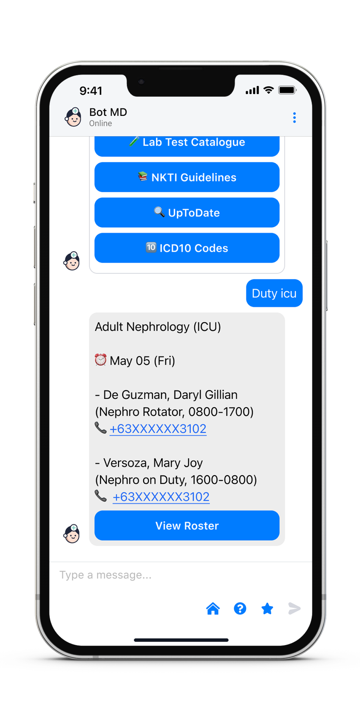 Bot MD has been integrated with NKTI specific hospital information including doctor duty rosters, the hospital directory, drug formulary, lab test catalogue and hospital protocols. Doctors and nurses can simply query the A.I. to obtain direct answers to the information they need. In addition the platform has also be integrated with third party professional medical resources such as the WHO ICD-10 codes, PhilHealth Case Rates, the Philippine National Formulary as well as clinical tools and information from UpToDate, MDCalc and QxMD. This will allow doctors and nurses in NKTI to quickly search the information they need to assist with their diagnosis, financial counseling and prescription workflows.