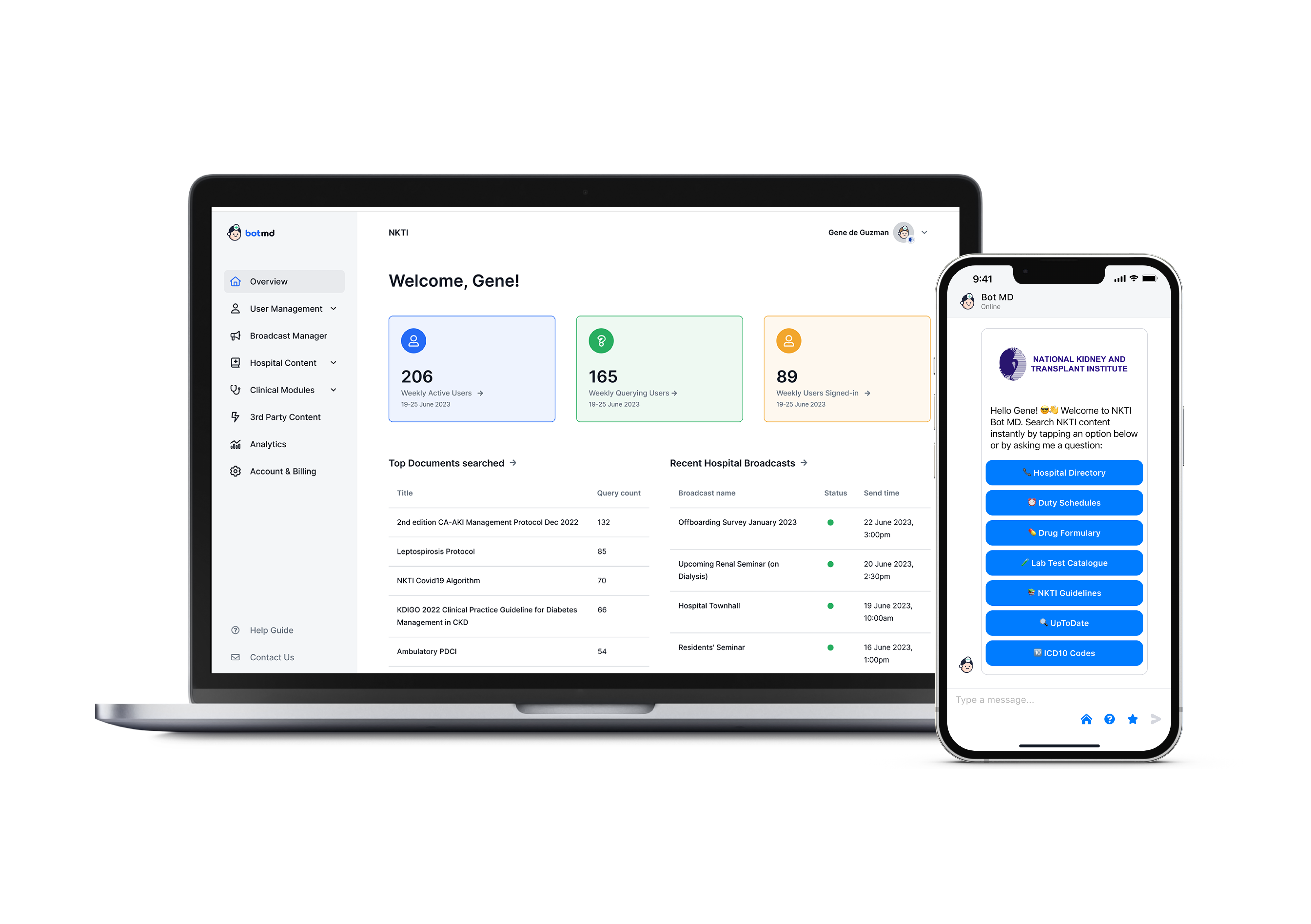 The National Kidney and Transplant Institute (NKTI) announced its partnership with Bot MD to launch the first of its kind A.I. clinical assistant in the Philippines. The Bot MD Hospital platform functions as a "Hospital Super App" which enables NKTI doctors and nurses to instantly search for all the hospital and clinical information they need within a single chat interface.
