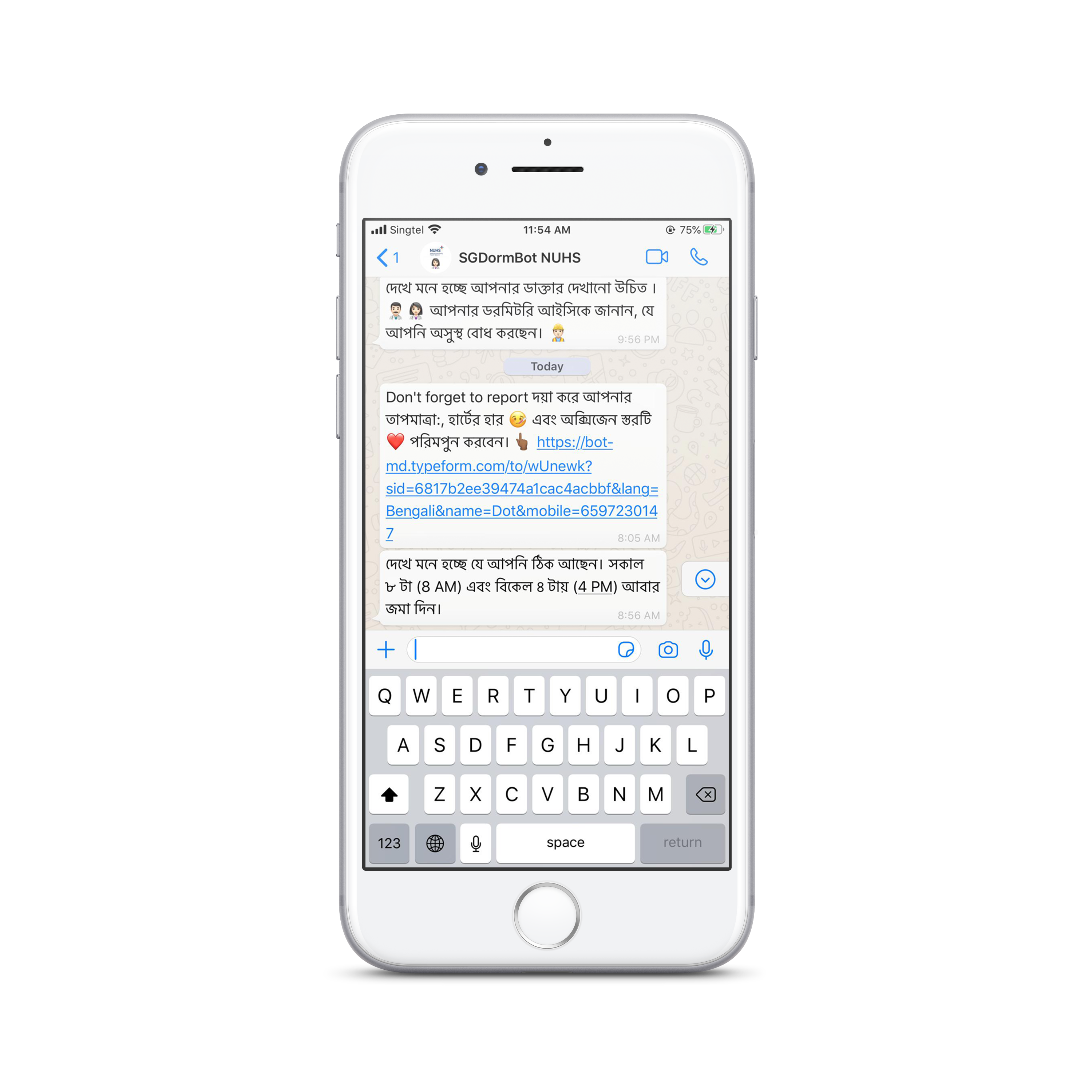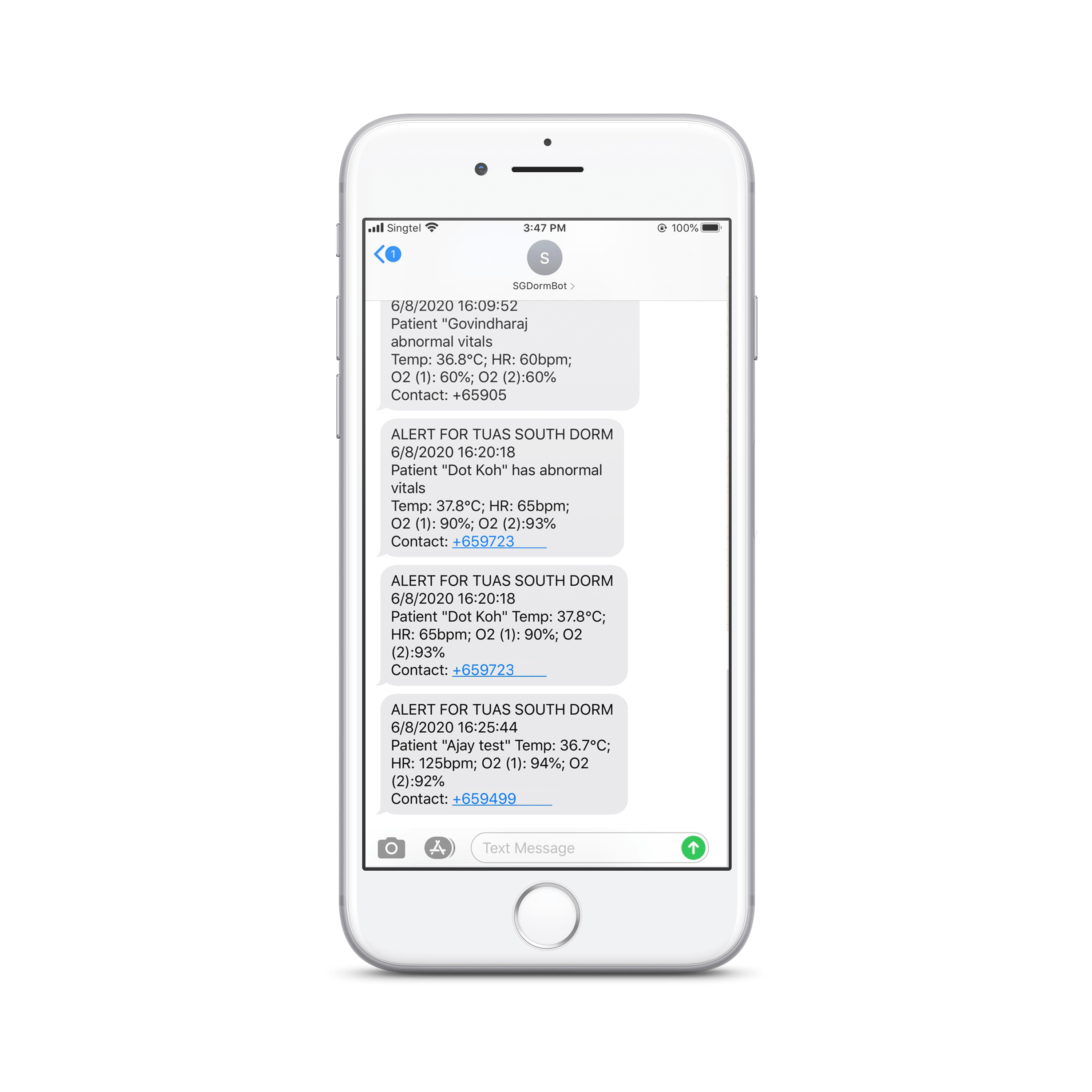 SGDormBot was developed to be easily accessed through widely available social messaging applications and provides a simple and user-friendly interface to remind COVID-19 positive residents to monitor their temperature, heart rate and oxygen levels in their native language. The bot also sends NUHS clinicians an instant SMS alert whenever there are abnormal vital signs reported, allowing them to intervene quickly through telehealth consultations.