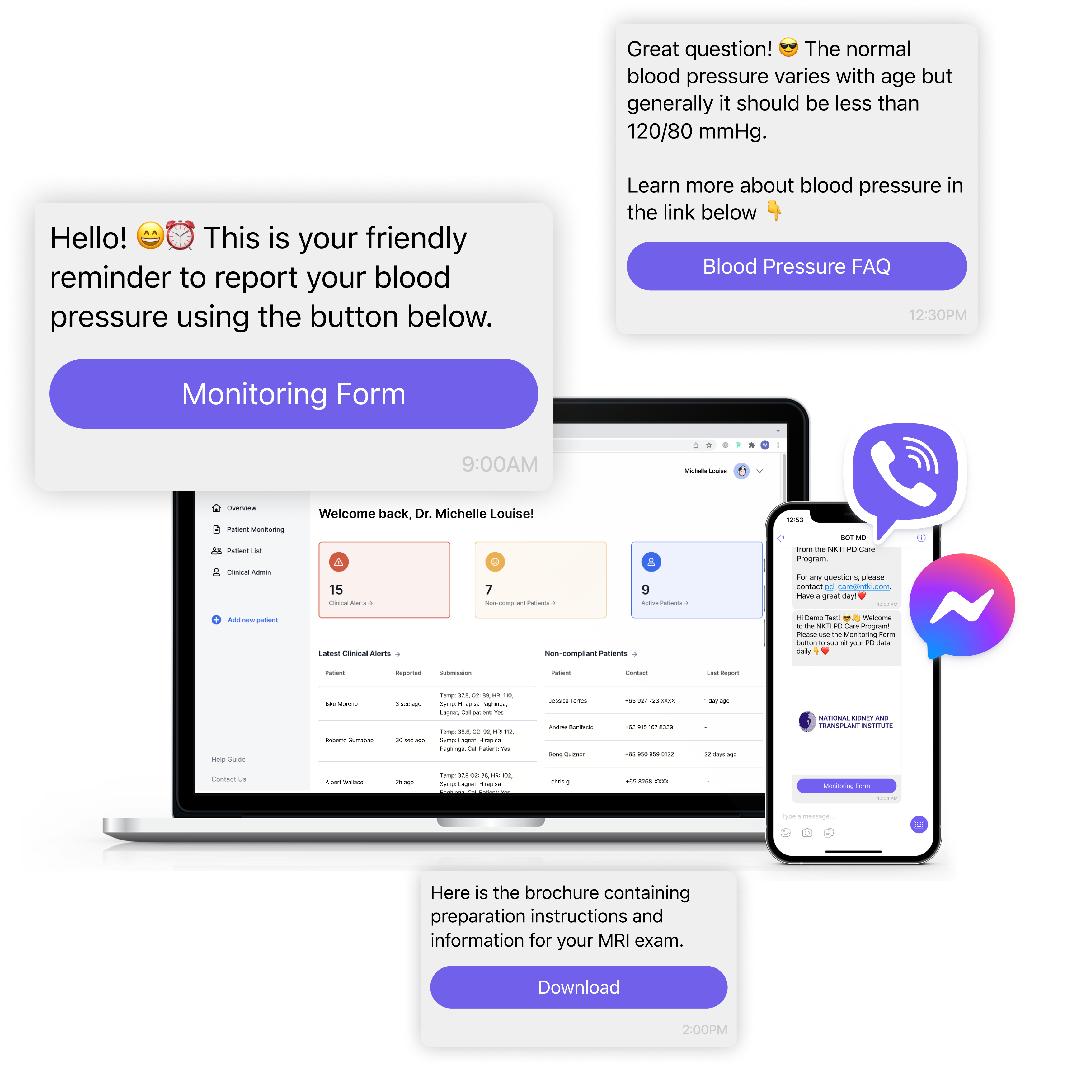 Reach more patients with Bot MD Care. It works across all home monitoring devices and chat platforms. Send your patients messages in any language.