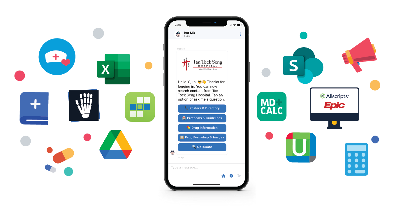 Bot MD integrates all your hospital information systems to provide instant answers to call rosters, hospital directory, guidelines, drugs, HR leave policies and more.